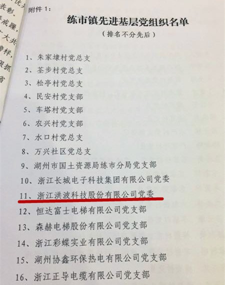 党在洪波:洪波党委成立于1997年,设立了设备齐全、教学严谨的“浙江省先进基层党校”,以内外交流、创新发展的“传帮带”党员带头模式,营造出了“青春党建”、“党员先锋”的优秀氛围。曾被评为:湖州市先进基层党组织、湖州市“发展强、党建强”先进企业党组织。